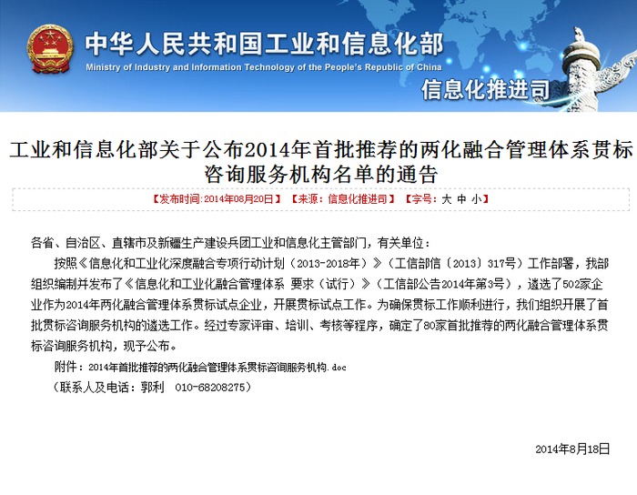 按照《信息化和工業(yè)化深度融合專項行動計劃(2013-2018年)》(工信部信〔2013〕317號)工作部署,工信部組織編制并發(fā)布了《信息化和工業(yè)化融合管理體系要求(試行)》(工信部公告2014年第3號),遴選了502家企業(yè)作為2014年兩化融合管理體系貫標(biāo)試點企業(yè),開展貫標(biāo)試點工作。為確保貫標(biāo)工作順利進(jìn)行,工信部信息化司組織開展了首批貫標(biāo)咨詢服務(wù)機構(gòu)的遴選工作。經(jīng)過專家評審、培訓(xùn)、考核等程序,確定了80家首批推薦的兩化融合管理體系貫標(biāo)咨詢服務(wù)機構(gòu),中國機械工業(yè)企業(yè)管理協(xié)會通過層層考核評審,成為80家獲得貫標(biāo)咨詢服務(wù)機構(gòu)資質(zhì)中唯一一家協(xié)會組織。