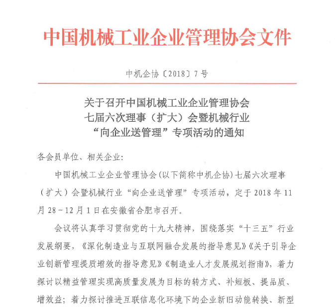 中機企協(xié)七屆六次理事(擴大)會暨機械行業(yè)“向企業(yè)送管理”專項活動通知