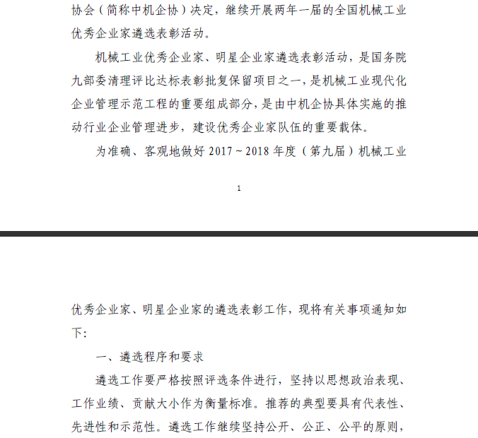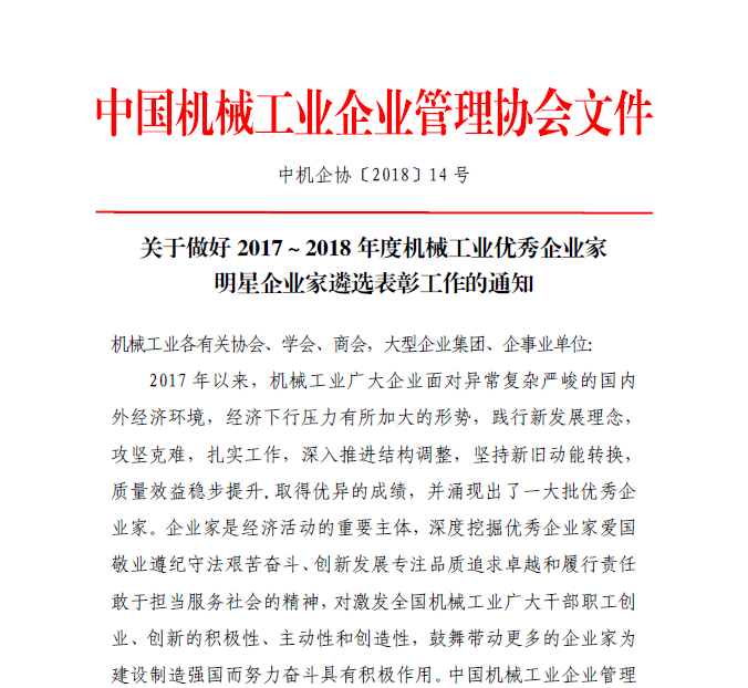關(guān)于做好2017~2018年度機(jī)械工業(yè)優(yōu)秀企業(yè)家、明星企業(yè)家遴選表彰工作的通知