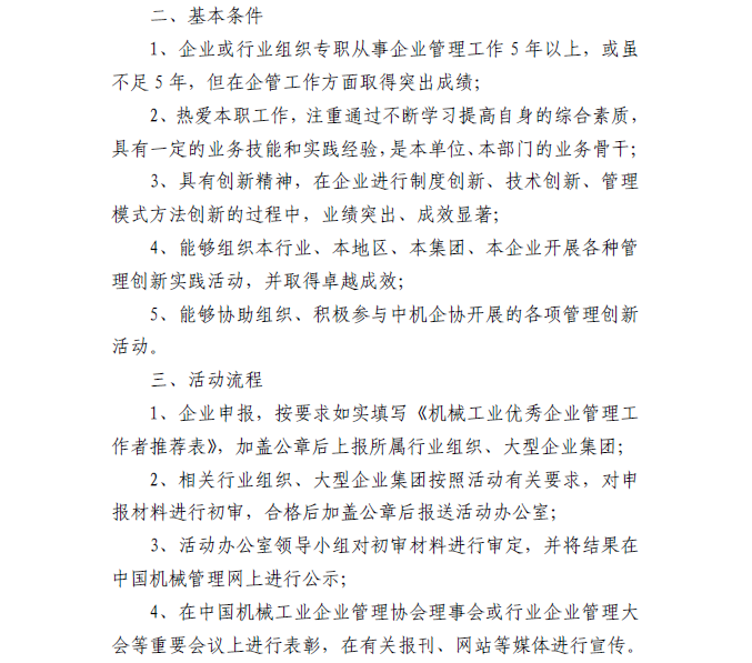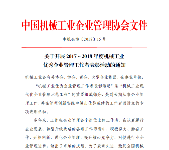 關(guān)于開展2017~2018年度機(jī)械工業(yè)優(yōu)秀企業(yè)管理工作者表彰活動的通知