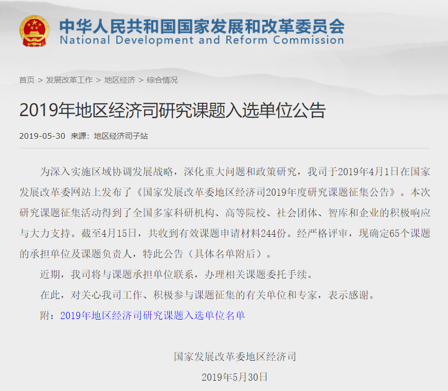 附件:2019年地區(qū)經(jīng)濟司研究課題入選單位公告