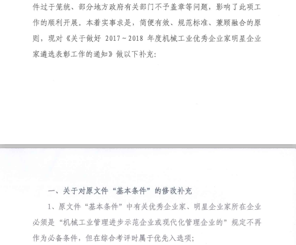關(guān)于做好2017~2018年度機(jī)械工業(yè)優(yōu)秀企業(yè)家明星企業(yè)家遴選表彰工作的補(bǔ)充通知