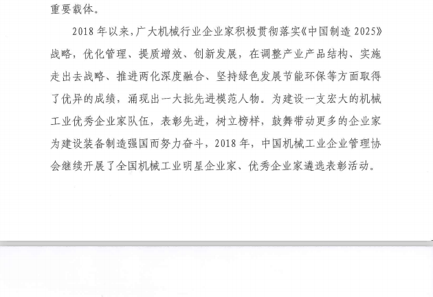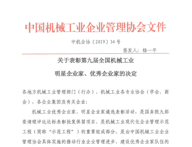 關(guān)于表彰第九屆全國機(jī)械工業(yè)明星企業(yè)家、優(yōu)秀企業(yè)家的決定