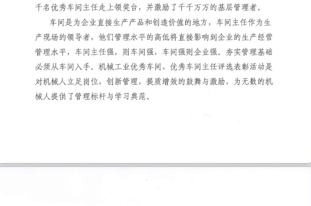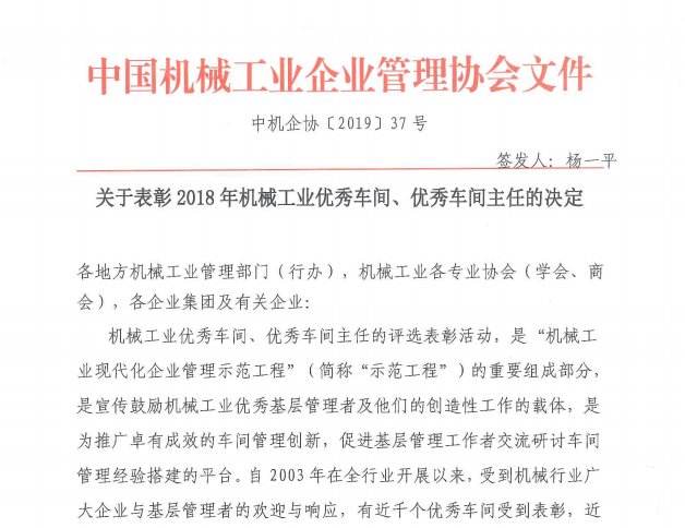 關(guān)于表彰2018年機(jī)械工業(yè)優(yōu)秀車間、優(yōu)秀車間主任的決定