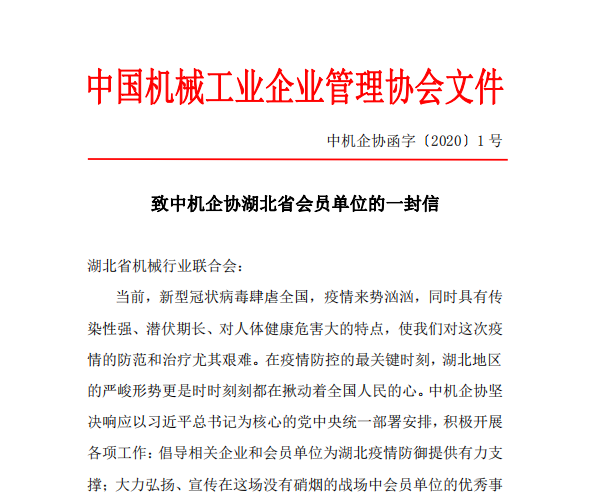 全民抗疫 同舟共濟(jì) 中機(jī)企協(xié)致信慰問湖北省會員企業(yè)